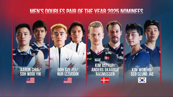 雙打方面,劉圣書/譚寧被提名年度最佳女雙,其他三對(duì)組合分別是韓國(guó)的白荷娜/李紹希、金慧貞/孔熙容以及馬來(lái)西亞的陳康樂(lè)/蒂娜。馮彥哲/黃東萍和蔣振邦/魏雅欣一同被提名最佳混雙,競(jìng)爭(zhēng)組合是泰國(guó)的德差波/蘇皮薩拉和馬來(lái)西亞的陳堂杰/杜依蔚。男雙四對(duì)提名組合分別是馬來(lái)西亞的謝定峰/蘇偉譯、吳世飛/伊祖丁,丹麥的阿斯特魯普/拉斯姆森,韓國(guó)的金元昊/徐承宰。